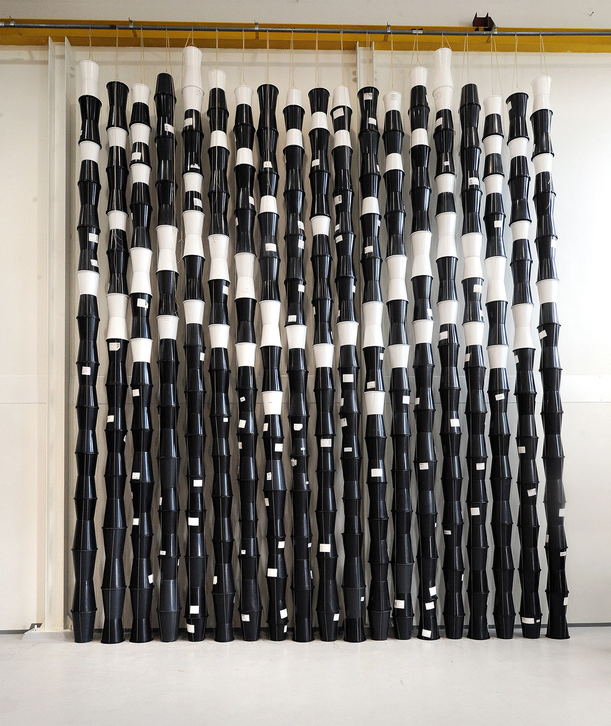 Et arbeid lagd av ca. 500 plastbøtter, plastsnor. 7 x 6 m. Laget til utstilling i Spriten Kunsthall, Skien i samarbeid med Hanne Øverland, Ingun Bakke og Sidsel Palmstrøm.
