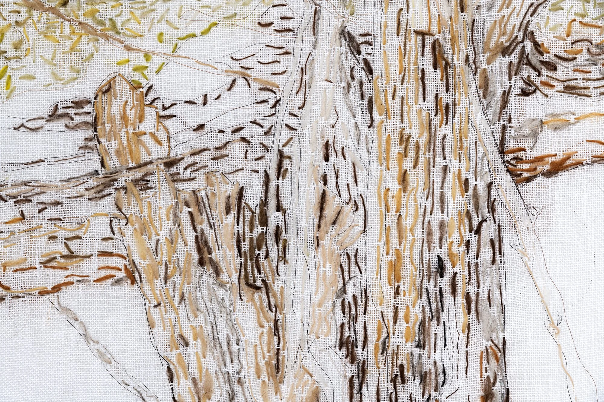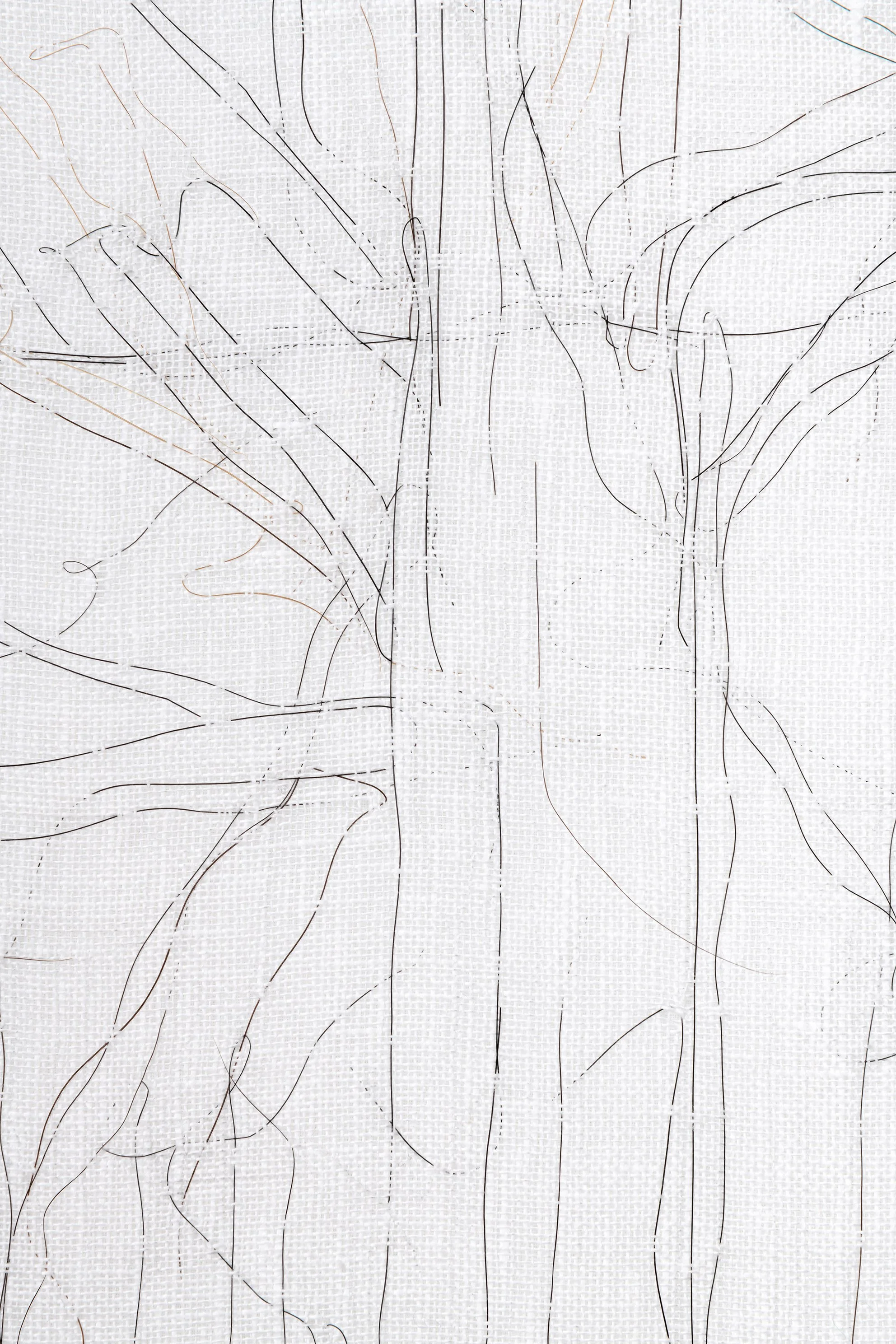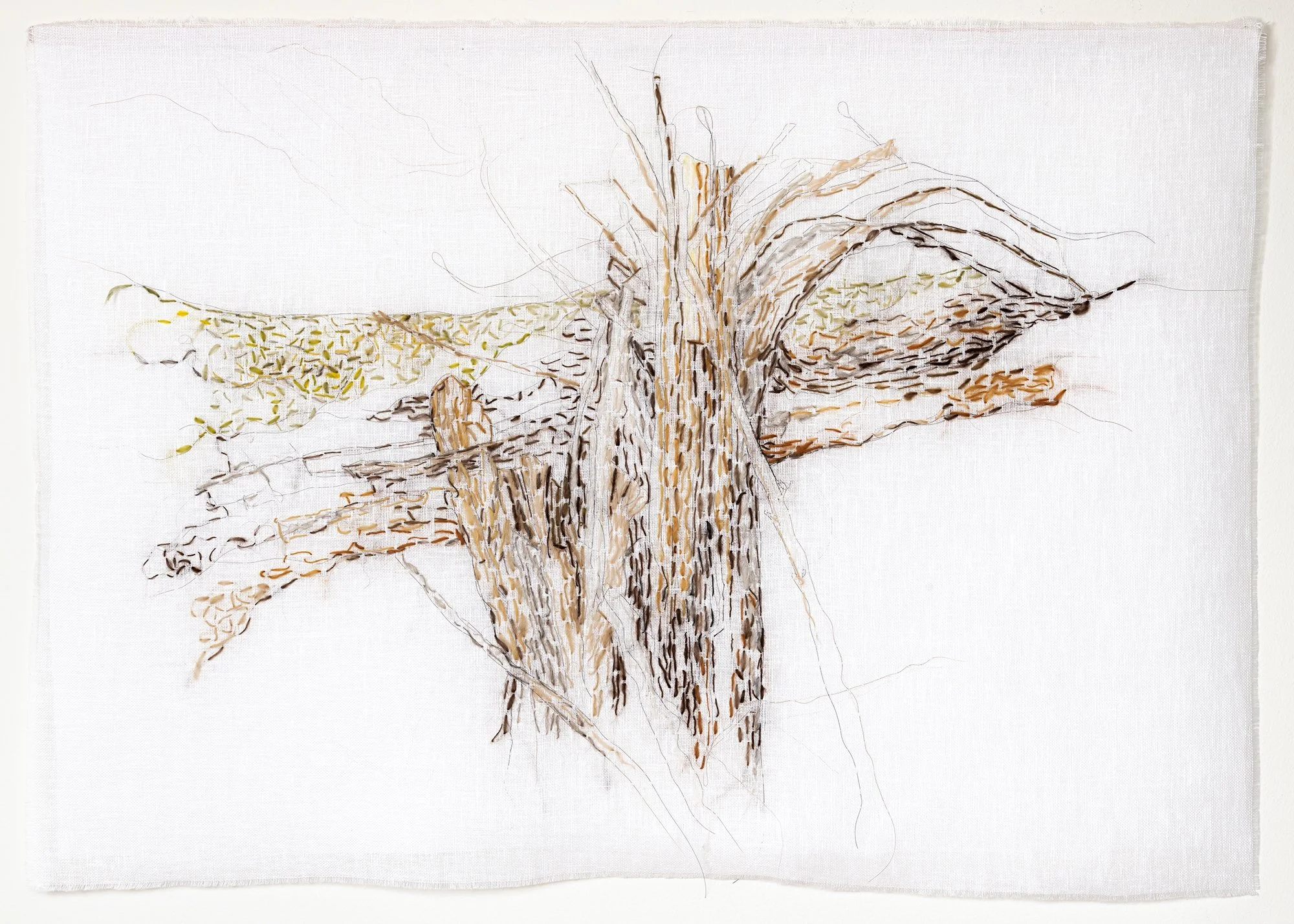 De siste årene har jeg arbeidet med store tegninger, som jeg tegner med tråd. Jeg broderer med hestehår og selvspunnet tråd i ull. Etter mange år i Norge gjør nå også skogens seg gjeldende og arbeidet får en helt annen fargepallett. Det har blitt utallige turer i fjellet og i skog og mark, hvor jeg sanker planter og andre vekster som jeg så bruker til å farge ull til mine broderte tegninger.
